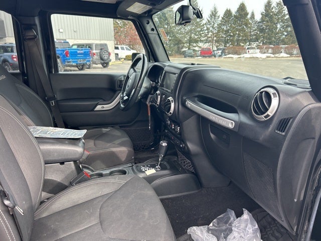 LaFontaine CDJR of Fenton is proud to offer this beautiful 2017 Jeep Wrangler an absolutely attractive-looking SUV with the following Features: Connectivity Group (Remote USB Port, Tire Pressure Monitoring Display, Uconnect Voice Command w/Bluetooth®, and Vehicle Information Center), Dual Top Group (Black 3-Piece Hard Top, Premium Black Sunrider Soft Top, Delete Sunrider Soft Top, Freedom Panel Storage Bag, Rear Window Defroster, and Rear Window Wiper/Washer), Quick Order Package 23G (Body Color Appliques Front Bumper, Body Color Appliques Rear Bumper, and Body Color/Accent Color Grille), Quick Order Package 24G, Trailer Tow Group (Class II Receiver Hitch and Trailer Tow w/4-Pin Connector Wiring), GPS Navigation, 18 x 7.5 Polished Satin Carbon Wheels, 3.21 Rear Axle Ratio, 4-Wheel Disc Brakes, 40GB Hard Drive w/28GB Available, 5-Year SiriusXM Travel Link Service, 6.5 Touchscreen Display, 8 Speakers, ABS brakes, Air Conditioning, Alloy wheels, AM/FM radio: SiriusXM, Audio Jack Input for Mobile Devices, Auto-dimming Rear-View mirror, Brake assist, CD player, Cloth Seats w/Adjustable Head Restraints, Compass, Driver door bin, Driver Height Adjuster Seat, Driver vanity mirror, Dual front impact airbags, Electronic Stability Control, Front anti-roll bar, Front Bucket Seats, Front Center Armrest w/Storage, Front fog lights, Front reading lights, Front Seat Back Map Pockets, Fully automatic headlights, Heated door mirrors, Heated Front Seats, Heavy Duty Suspension w/Gas Shocks (DISC), Hill Descent Control, Illuminated entry, Integrated roll-over protection, Leather steering wheel, Low tire pressure warning, Occupant sensing airbag, Outside temperature display, Panic alarm, Passenger door bin, Passenger vanity mirror, Power door mirrors, Power steering, Power windows, Radio data system, Radio: 130, Radio: 430, Rear anti-roll bar, Remote keyless entry, Remote Start System, Security system, SiriusXM Travel Link, Speed control, Split folding rear seat, Steering wheel mounted audio controls, Sunrider Soft Top, Tachometer, Tilt steering wheel, Tip Start, Traction control, Trip computer, and Variably intermittent wipers.